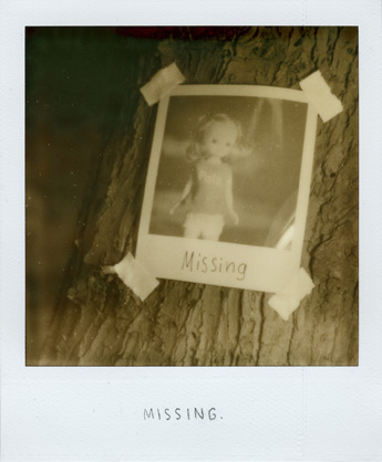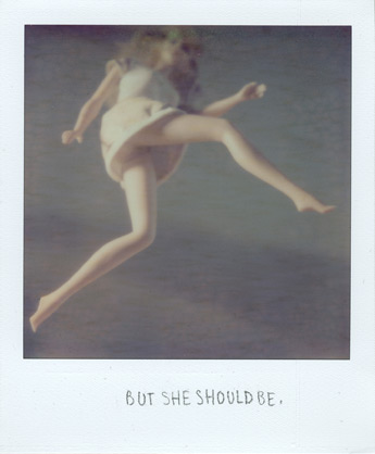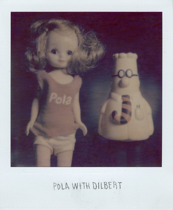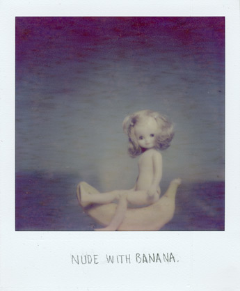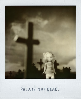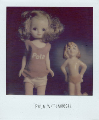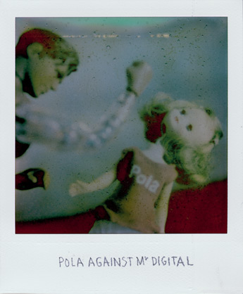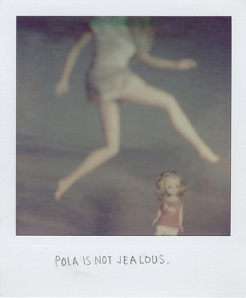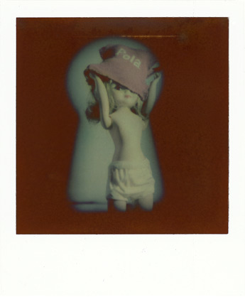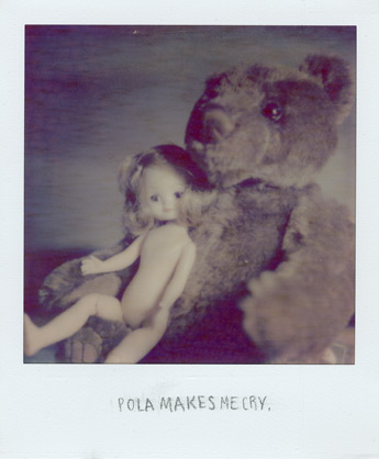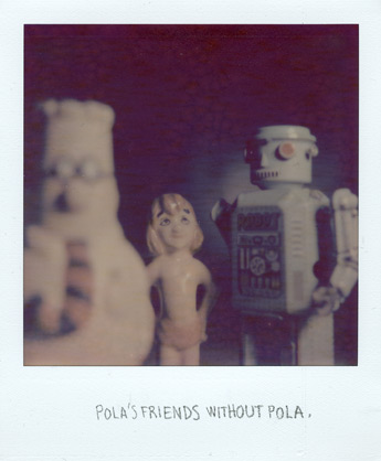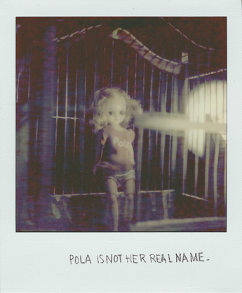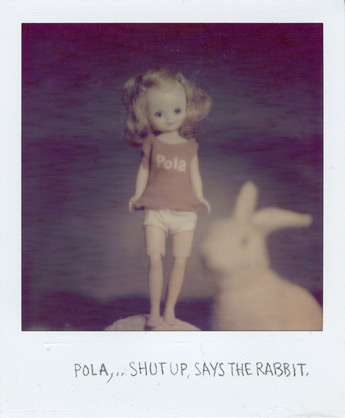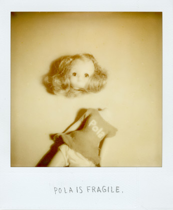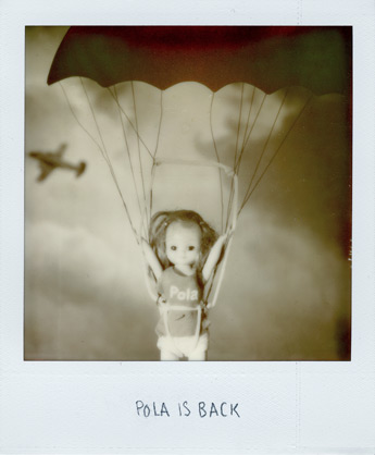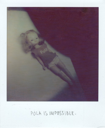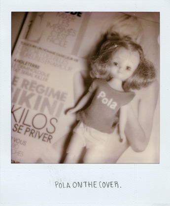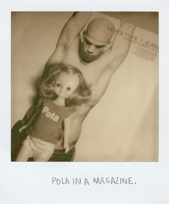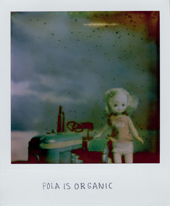 Pour moi "film instantané" se dit Pola. J'ai l'habitude d'utiliser du Fuji FP100 et j'ai toujours demandé au vendeur - donnez moi 10 boites de "Pola" FP 100. Je sais c'est mal. A partir de ce nom j'ai imaginé une série de photo avec un personnage portant ce nom sur son t-shirt. J'ai d'abord fait des essais avec une comédienne mais cela ne fonctionnait pas. J'ai donc utilisé une petite poupée que j'ai installée devant des minis-décors. Le propos devenait alors plus étrange et aussi, je l'espère, un peu plus poétique. Voilà.